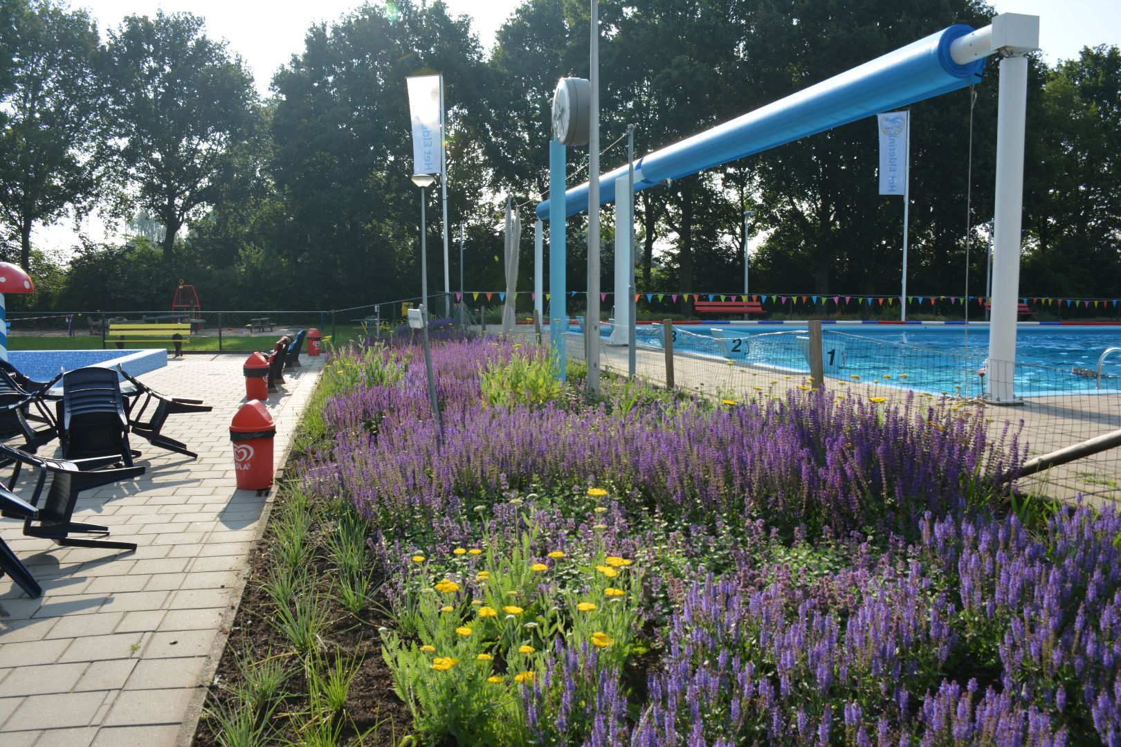 De 'rivier' van Salvia bestaat uit sterke beplanting die tevens het water weerspiegelt van het zwembad (zie de referentiefoto’s op het beplantingsplan). De bloeitijden van de verschillende vaste planten zijn op elkaar afgestemd waardoor er het gehele zwemseizoen van half april tot eind september een aantrekkelijke beeld ontstaat voor de bezoekers van het zwembad.